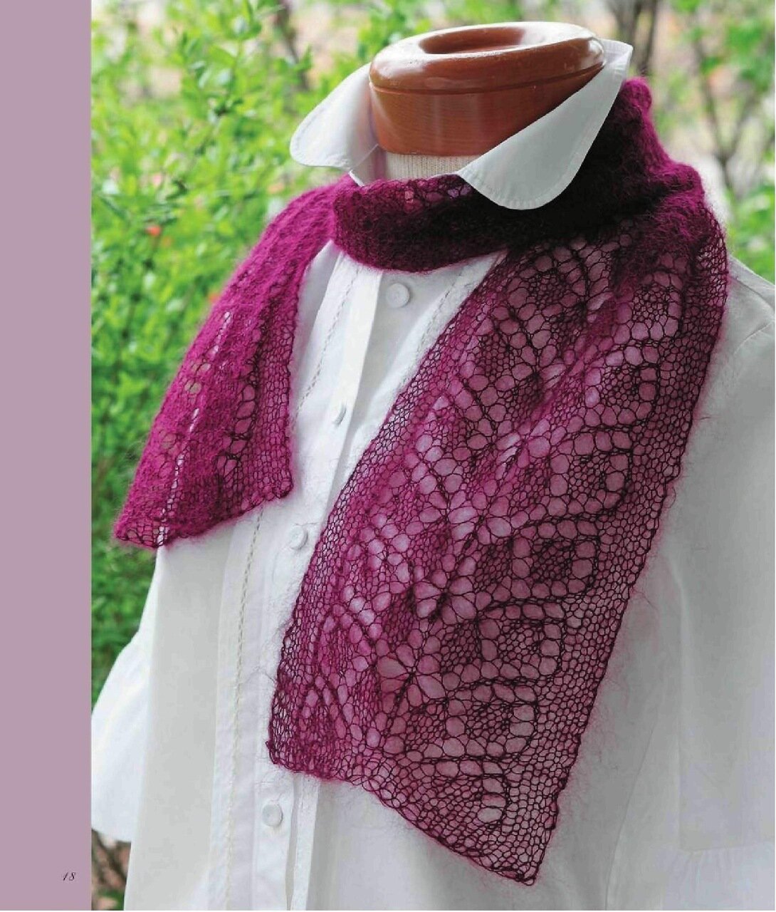 На тонком шарфике, прекрасно смотрятся не только узоры из листьев, но и ряды ажурного орнамента. Если вы решите вязать такой шарфик, то первые и последние две петли, не считая кромочных, вязать платочной вязкой.