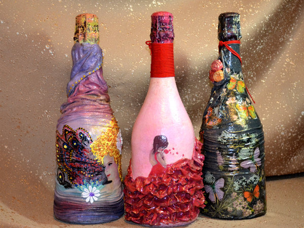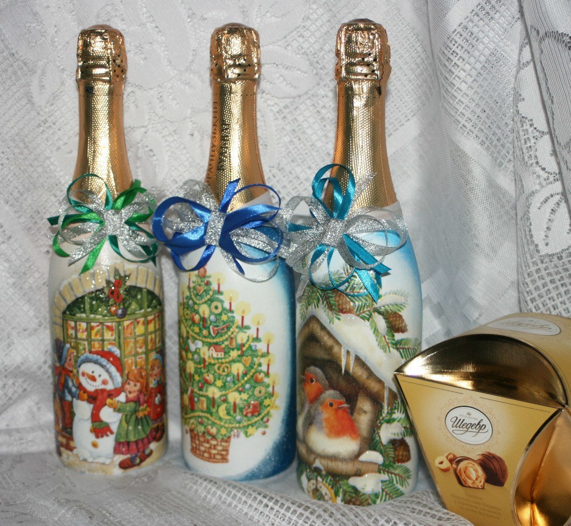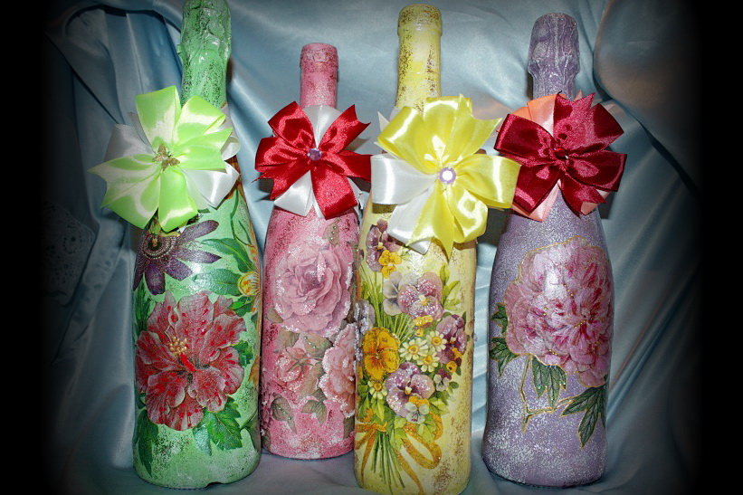 Декупаж бутылок — это одна из разновидностей данной техники, причем самая популярная. Всего лишь вспомните сколько сувениров, подарков и предметов декора сделано из обычной бутылки. Пожалуй знакомство с этим интересным видом рукоделия, можно начать сделав декупаж бутылок своими руками.