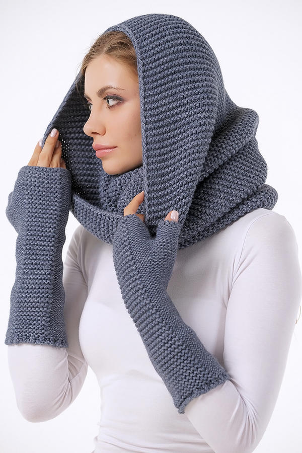 10х10 см связанные английской резинкой на - спицах 8, примерно 7 петель и 17 рядов. Носят его по-разному, например, длинный шарф-хомут складывают восьмеркой и одевают на шею, поверх воротника верхней одежды, или в виде перекрученной петли, ес