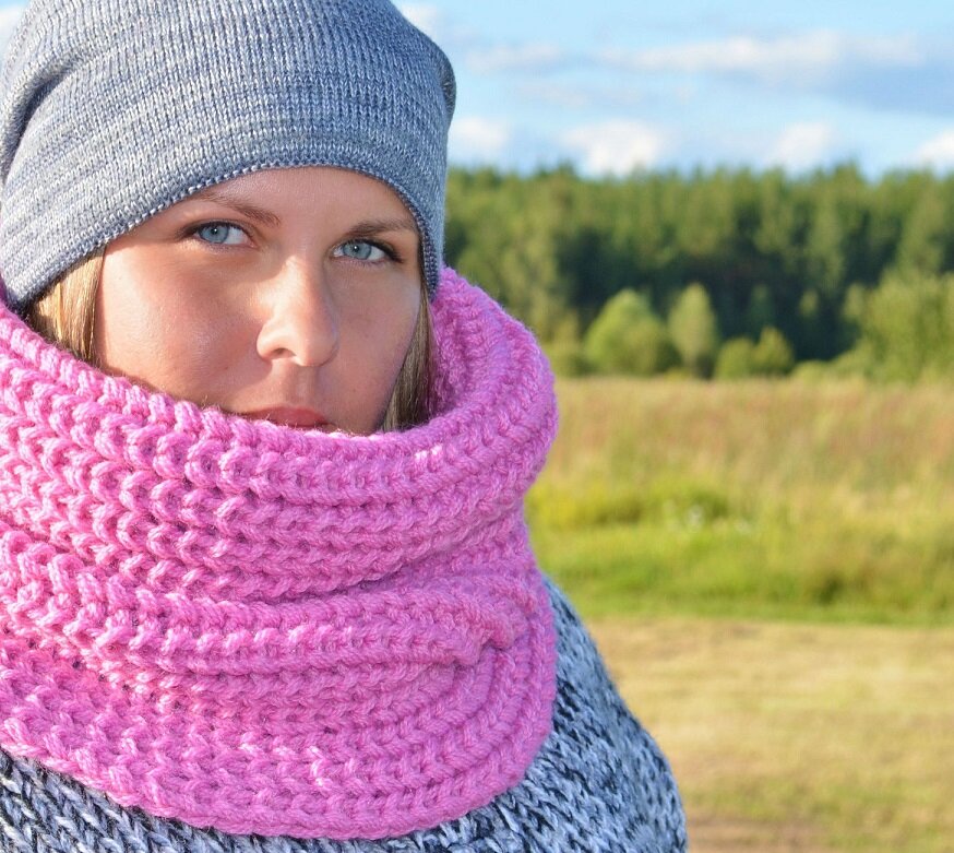 В этом сезоне шарф-труба на пике популярности у модниц. Этот аксессуар носят как девочки-подростки, взрослые женщины, так и дамы в возрасте. Главное – это правильно подобрать фасон, чтобы выглядеть неотразимо. Предлагаю вашему вниманию еще одну интересную идею для вязания шарфа – крупные косы в розовом цвете. Очень по-весеннему и невероятно …