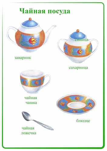 Материалы: рисунки различных видов посуды; разрезные картинки посуды на четыре части, игрушечная посуда, оборудование для развития речевого дыхания (чашки), предметы столовой посуды для сервировки стола, заварной чайник, чашка, горячая вода, мяч