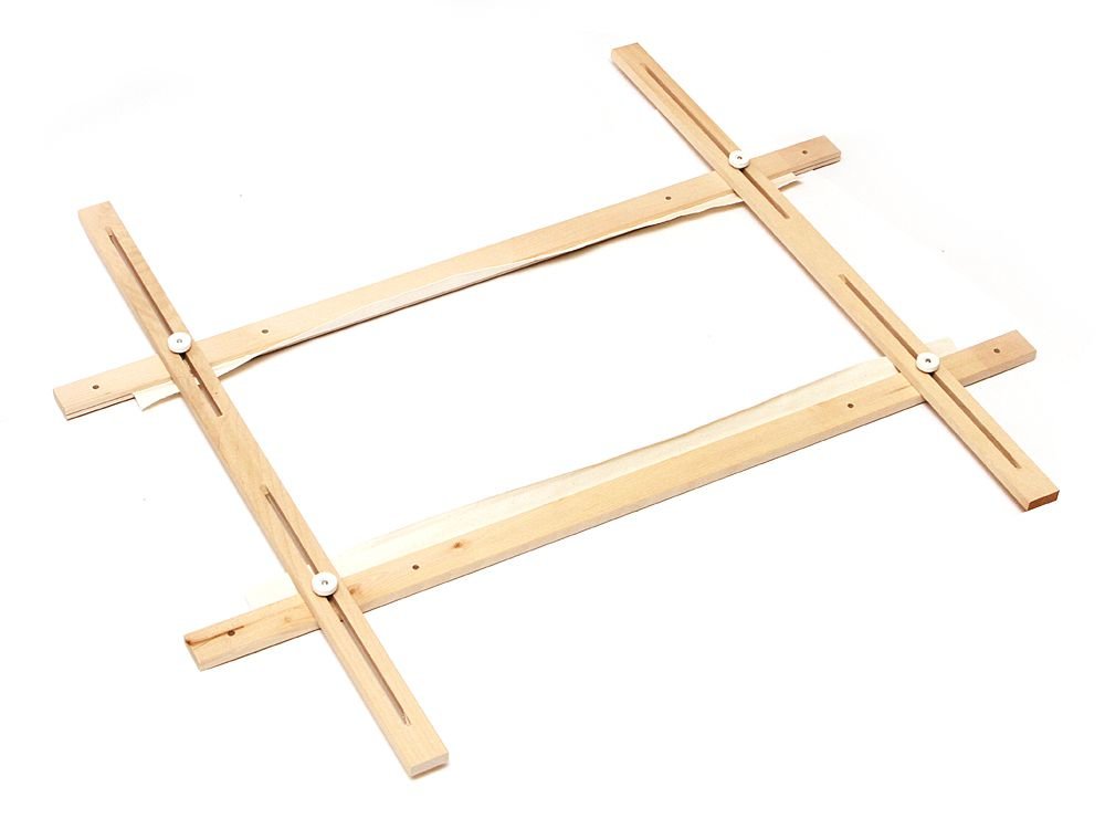 Гобеленовая рама представляет собой деревянный прямоугольник, к которому канва крепится только сверху и снизу.