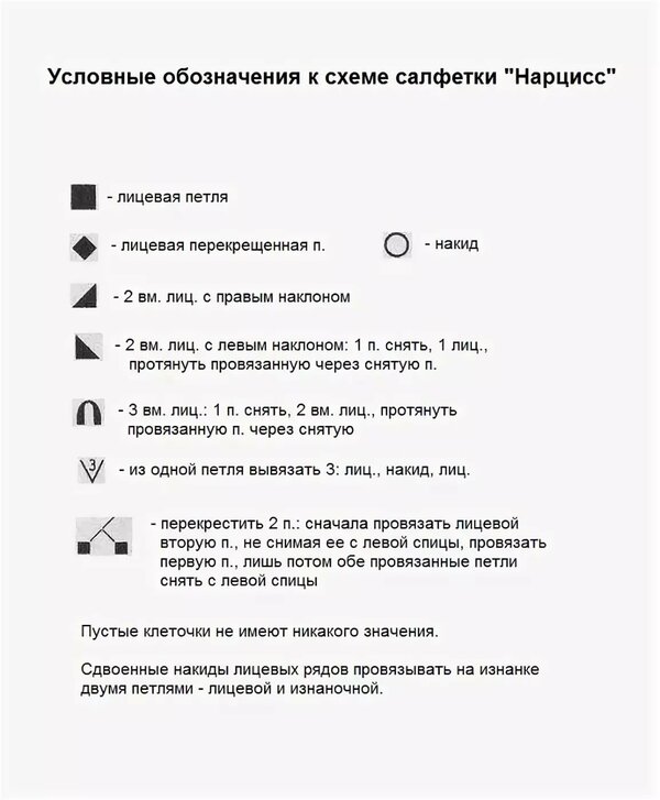 Условные обозначения при вязании спицами с описанием на схемах
