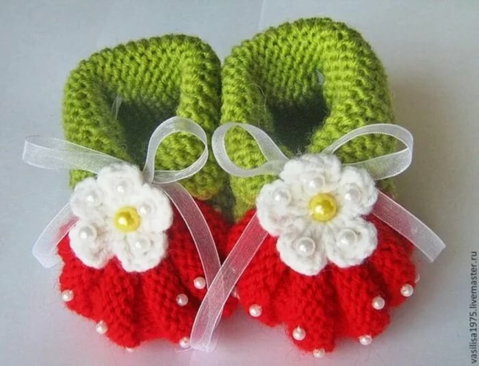 - украшать вязаную обувь можно помпонами, бусинами, шнурками, цветочками, нашивками.