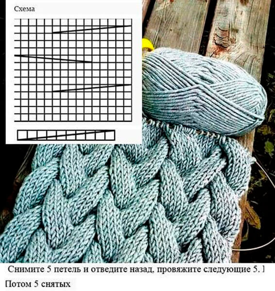 2. Далее перейдите на более крупные спицы №5 и вяжите узор из кос по схеме 1. При этом в 1-м ряду равномерно прибавьте 32 п.