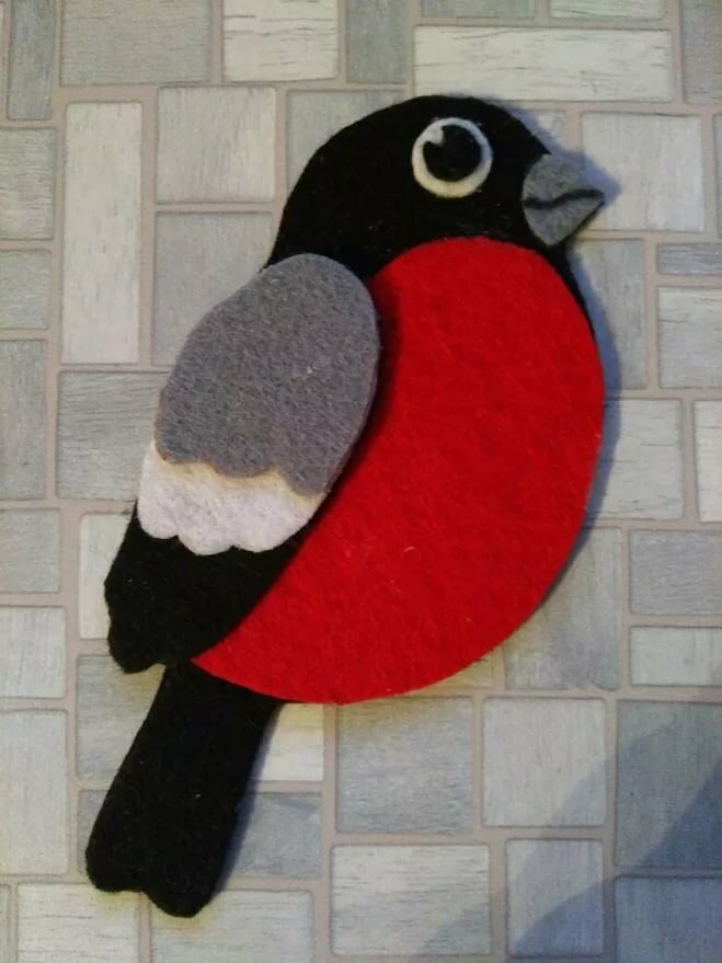 8. Останется лишь оформить голову. Наклейте глазки и маленькие желтые клювы. Можно сделать с обратной стороны симметричную поделку. Снегирь будет хорошо себя чувствовать на открытке, на елочке, в виде гирлянды. Можно придумать очень много способов использовать эти фигурки, вы обязательно найдете именно свой.