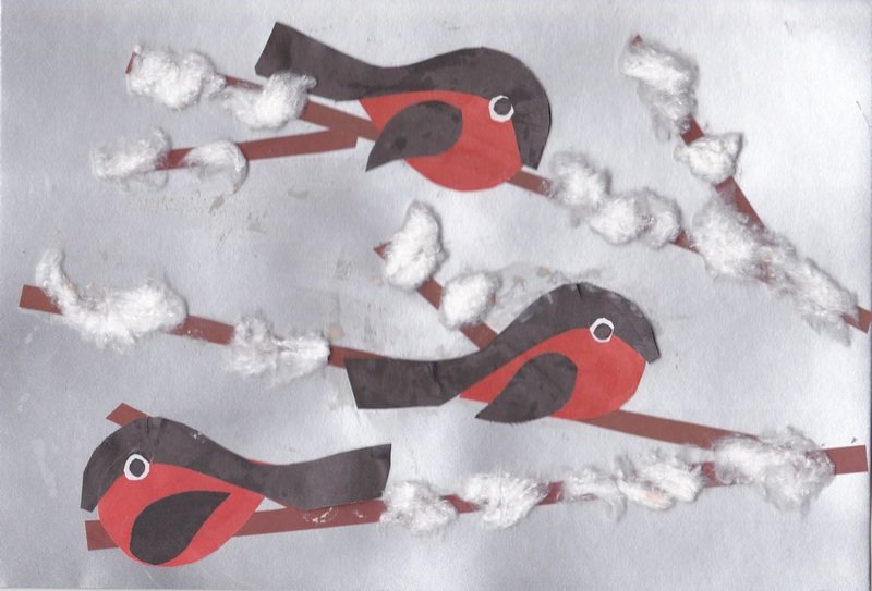 Вот такая зимняя аппликация с яркими снегирями у нас получилась.