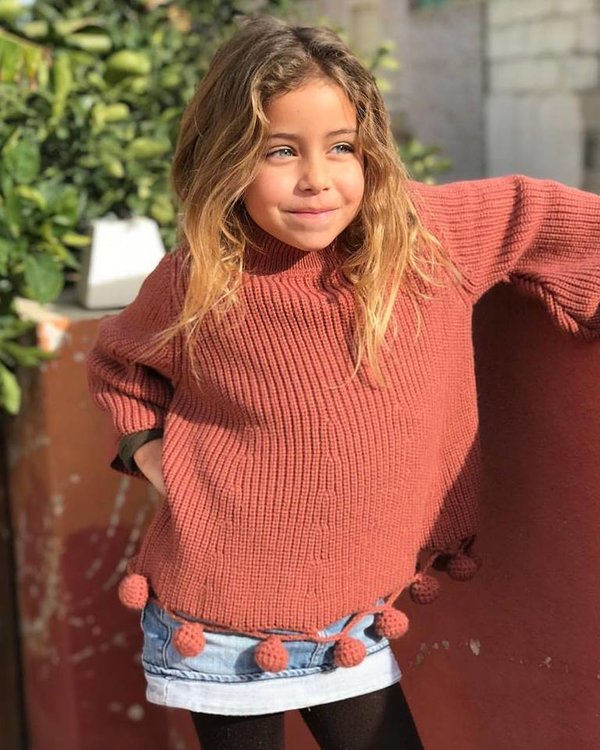 Такой прелестный пуловер для девочки можно связать из шерсти с акрилом. Такой пуловер можно одеть и в садик, и в школу – модная, отличная модель. Рукав здесь чуть приспущен, поэтому вяжите в начале спинку и перед, а потом рукава. Так вы сможете сами, измерив расстояние от шеи до запястья ребёнка, чётко определить нужную длину рукава.