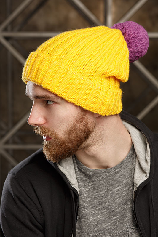 После этого вяжем двадцать три ЛП. Далее снова выполняем четыре Р на всех оставшихся П. Данную технику будем повторять, пока длина окружности не достигнет нужной величины. В конце работы нужно закрыть П последнего Р, и сшить шапку. Втягиваем в верхний край шапки пряжу от клубка, одновременно затягивая отверстие, и закрепляя пряжу на изнаночной стороне. Теперь нам осталось сделать красивый помпон из желтых ниток, и шапочку можно надевать.