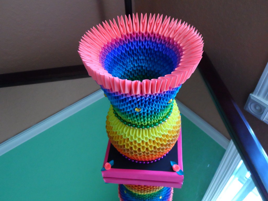 В зависимости от размеров будущего изделия, зависит и количество модулей, которые будут использоваться для создания вазы. Чем больше ваза, тем сложнее процесс ее создания. Если еще и делать красивую, разноцветную вещь, понадобится много ярких модулей. Кроме разноцветных полосок, на таких изделиях могут быть и красивые узоры.