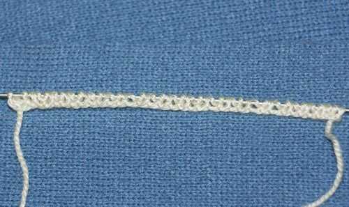 - 1-й ряд — последовательность: лиц., накид, снимаем петлю не провязывая, рабочая нить должна размещаться сзади работы. И так до окончания ряда.