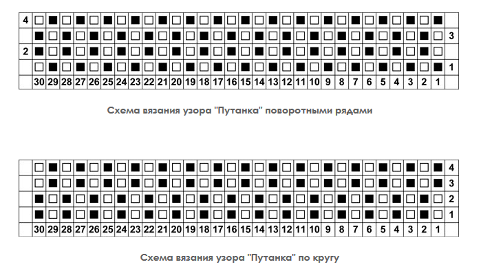 Если нужно вязать узор путанка по кругу, то поступаем точно также: в каждом ряду лицевые и изнаночные петли чередуем в шахматном порядке: над лицевой петлёй провязываем изнаночную, а над изнаночной – лицевую петлю.
