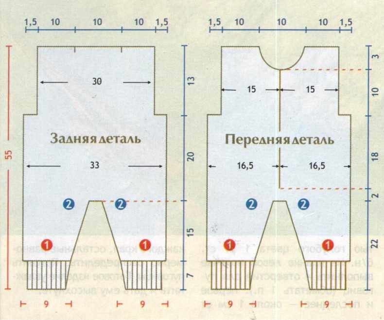 На высоте 17 см по спинке от линии горловины начните выполнять белые скосы.