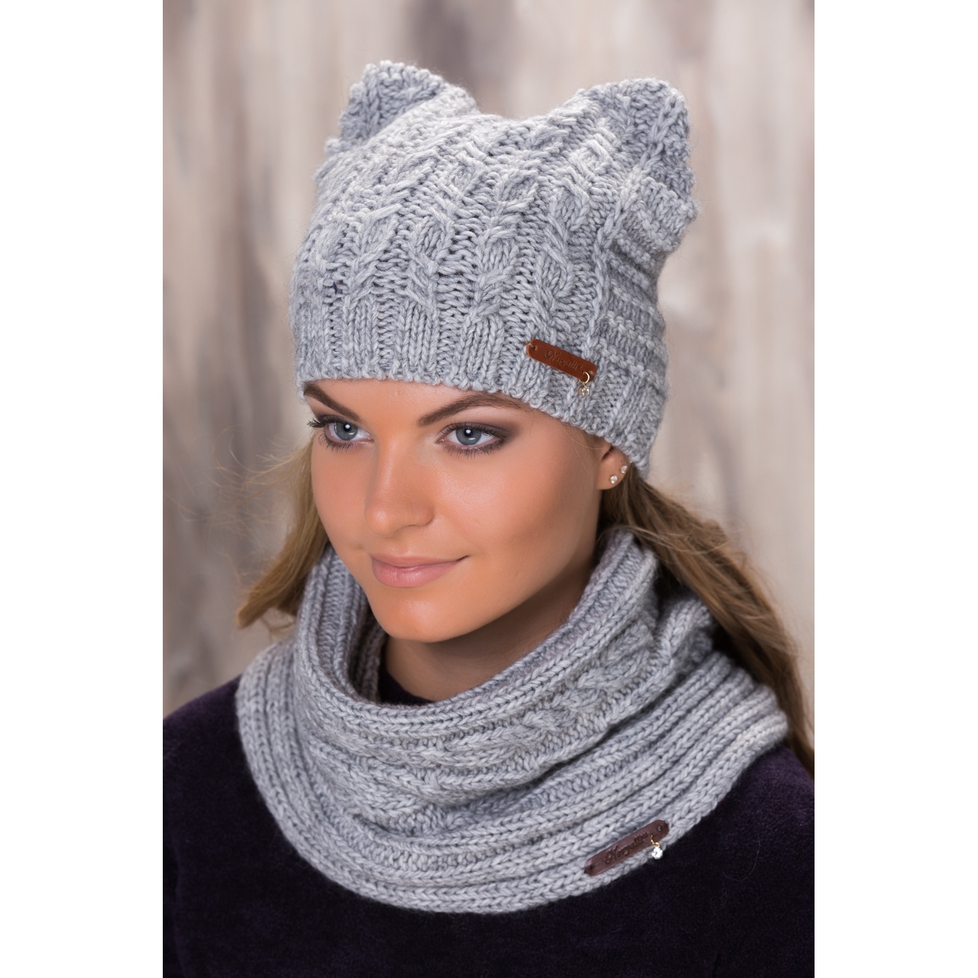 Оригинальная шапка и небольшой, плотно прилегающий к шее, снуд создают гармоничную композицию. С ее помощью можно внести новые решения в повседневный образ, украсив теплый наряд в демисезонный и зимний период. Представленные элементы гардероба не имеют практических и стилистических ограничений в плане вариантов использования. Светло серый цвет вязаных уборов подойдет под …