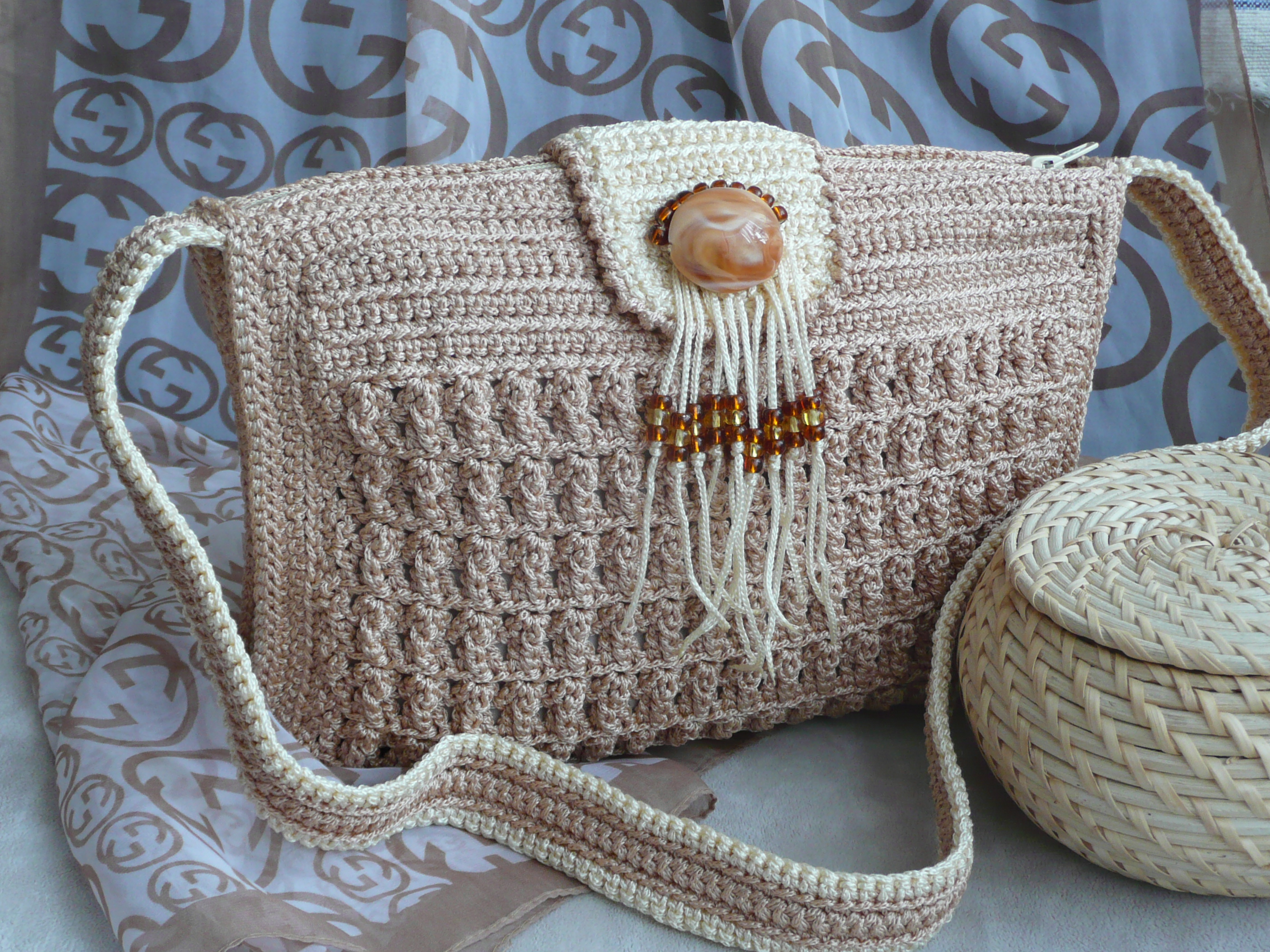 Особенно элегантно и нежно смотрятся модели белого, песочного, кремового, кофейного цвета. Они замечательно комбинируются как с короткими летними платьями, так и с длинными струящимися нарядами. Светлые брюки или джинсы также практически всегда создают удачное сочетание с красивой вязаной сумкой.