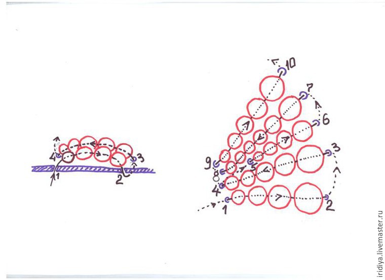 - «Вперед иголку» — иглу проводят на лицевую сторону, на нее нанизывают бусину. На расстоянии, равном размеру бусины, делается прокол на изнаночную сторону.