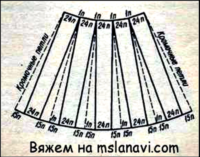 Очень часто по линии декоративных прибавок проходит рисунок: жгут или коса. В обычной юбке-трапеции прибавки делаются по боковому шву и, если пряжа тонкая, в середине полотна. При этом количество вытачек в юбках-«клинках» равно количеству границ между клиньями.