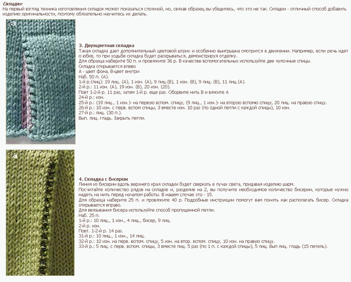 2. Юбки-гофре, или плиссе, могут вязаться в поперечном направлении и сверху вниз. В обоих случаях для получения рубчика между определенным количеством петель платочной или чулочной вязки, образующих ширину складки, вывязываются вертикальные дорожки из лицевых или изнаночных петель. Для более выраженного эффекта «плиссе» по линии талии формируются складки.