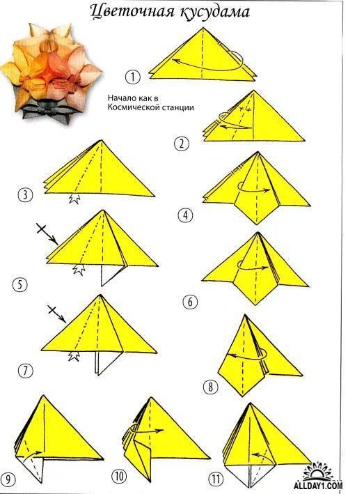 Модули оригами могут быть не только треугольными, но также квадратными и прямоугольными.Здесь рассматривается монтажная схема треугольного модуля.
