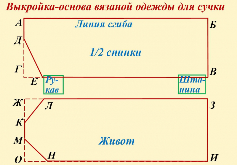 В процессе работы не забывайте про схематичный рисунок выкройки свитера для собаки, он поможет вам достичь желаемого результата.